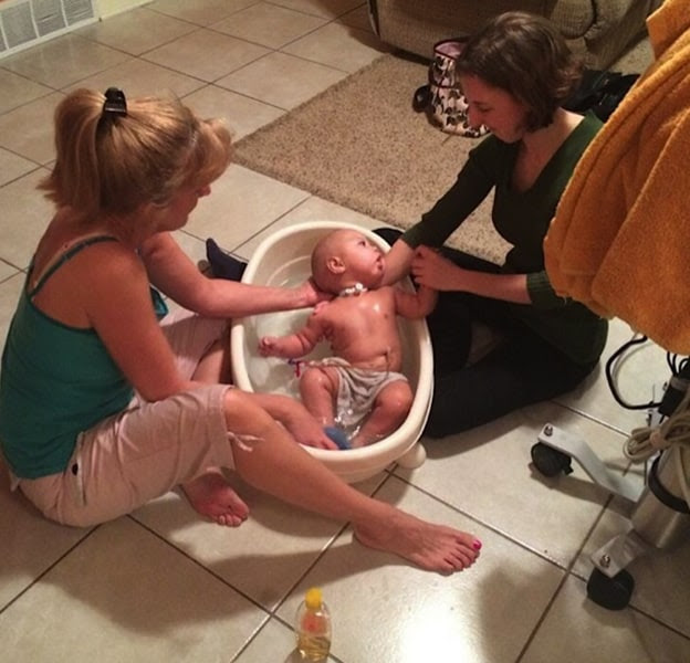 Salchert's daughter, Johanna, 22, helps her bathe baby.